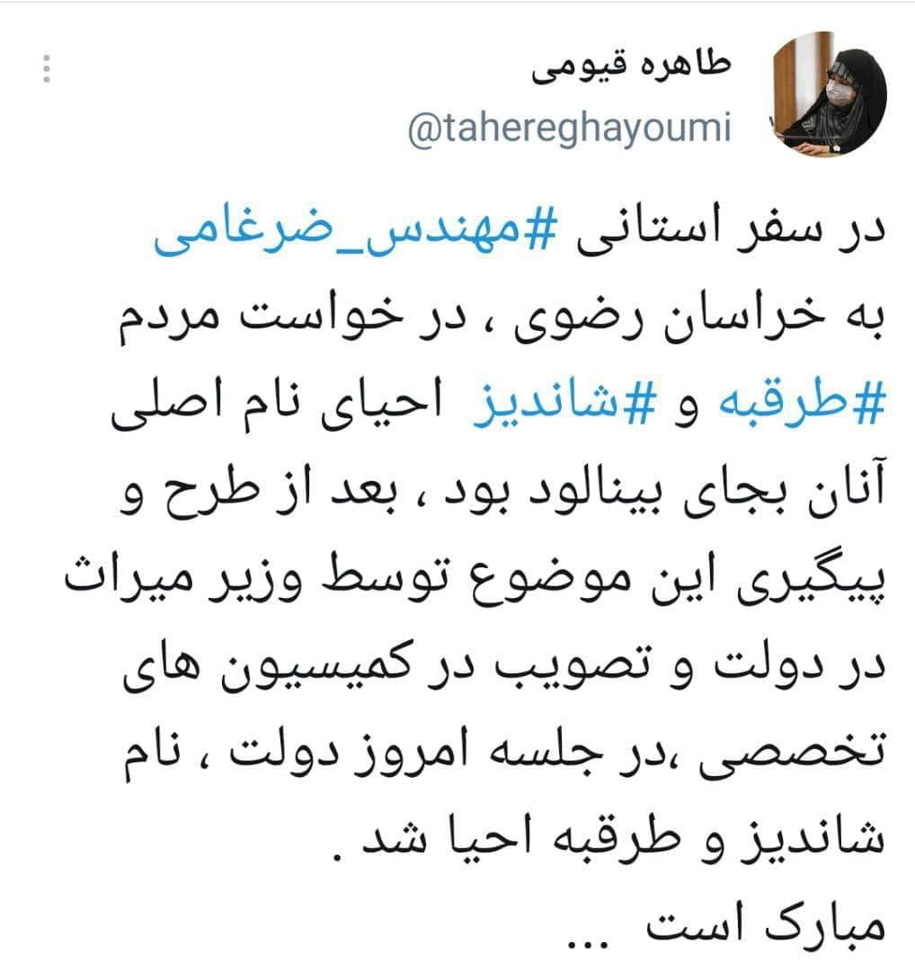 به گزارش تابناک رضوی، طاهره قیومی با بیان این خبر عنوان کرد: در سفر استانی مهندس ضرغامی به خراسان رضوی، درخواست مردم طرقبه و شاندیز احیای نام اصلی آنان بجای بینالود بود، بعد از طرح و پیگیری این موضوع توسط وزیر میراث فرهنگی در دولت و تصویب در کمیسیون های تخصصی، در جلسه امروز دولت، نام شاندیز و طرقبه احیا شد.