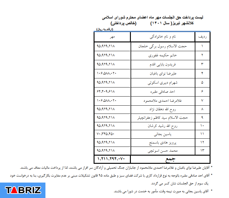 لیست دریافتی و حقالجلسات اعضای شورای اسلامی شهر تبریز در مهرماه منتشر شد. لیست حقالجلسات اعضای این شورا به منظور رعایت شفافیت و طبق روال قبلی منتشر شد.