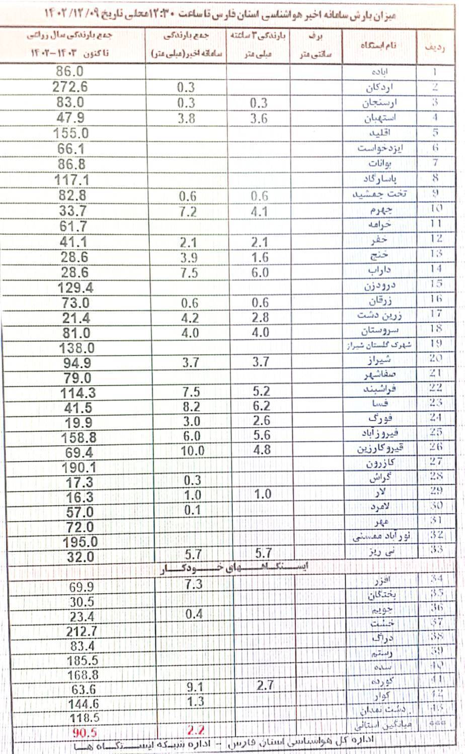 تابناک فارس به نقل از صدا و سیما: مدیرکل هواشناسی فارس گفت: بیشترین میزان بارندگی سامانه اخیر در استان تا ظهر امروز در قیروکارزین ۱۰ و کورده خنج ۹ و یک دهم میلی متر بوده است.