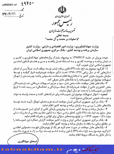 اخیرا نیز با استناد به مدرک دریافتی که تصویر آن در ذیل مطلب الصاق شده است ،براساس تصویب نامه شماره 49750مورخه 97/04/21هیات وزیران که با امضاء معاون اول رییس جمهور به وزارت جهاد کشاورزی ،وزارت امور اقتصادی ودارایی ،سازمان برنامه وبودجه و بانک مرکزی کشور ابلاغ شده ؛امهال تسهیلات کشاورزان مناطق متاثر از حوادث غیرمترقبه را خواستار شده است.